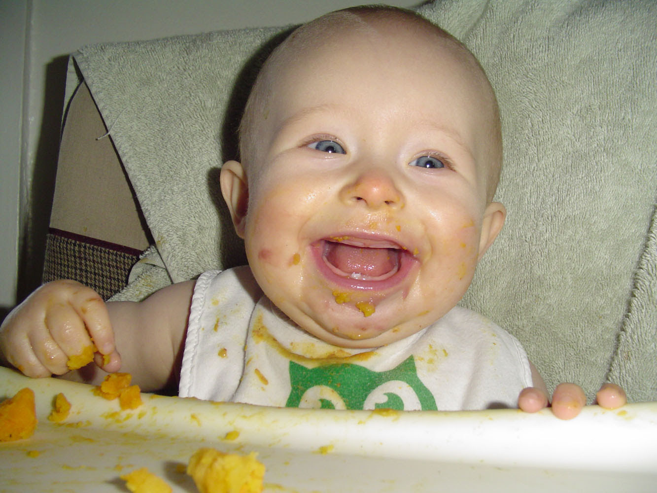 Gilly has two teeth, but only one is obvious in this picture (click on the image for a much larger version). The second tooth is right next to this one, but I think the drool and squash make it tough to see.